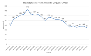 Toch volgde in de jaren na de verhuizing een ontwikkeling die de positie van de club ter discussie stelt. Na een bloeiperiode rond 2004–2009 kwam de Koninklijke UD in een langdurige fase van krimp terecht. In het topseizoen 2008/2009 telde de club 740 leden, inmiddels zijn dat er in 2025/2026 nog 344, een daling van meer dan de helft. Vooral bij de jeugd is die terugloop zichtbaar. Waar vroeger per lichting vaak 25 tot 35 spelers op het veld stonden, zijn dat tegenwoordig soms nog maar 10 tot 15. Ook het vrouwenvoetbal is vrijwel volledig verdwenen: in 2005/2006 had UD nog 37 senioren vrouwen, maar sinds 2021/’22 staat dat aantal structureel op nul. Tegelijkertijd vormen de senioren mannen nog altijd de stabiele kern van de vereniging, met ook nu nog rond de 190 spelers.
