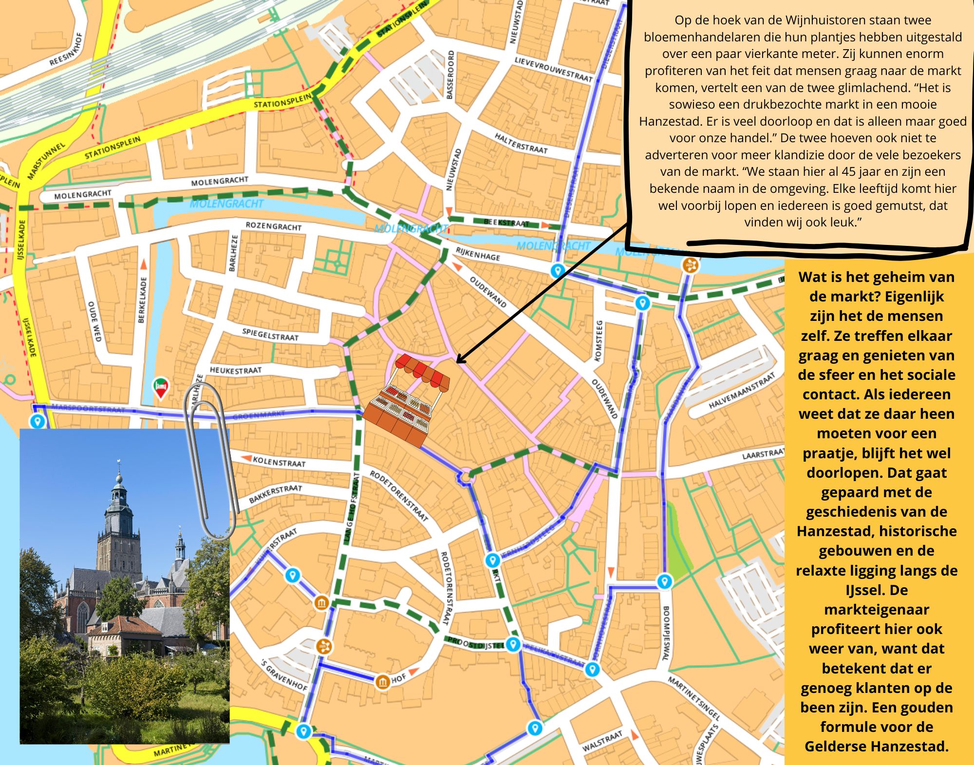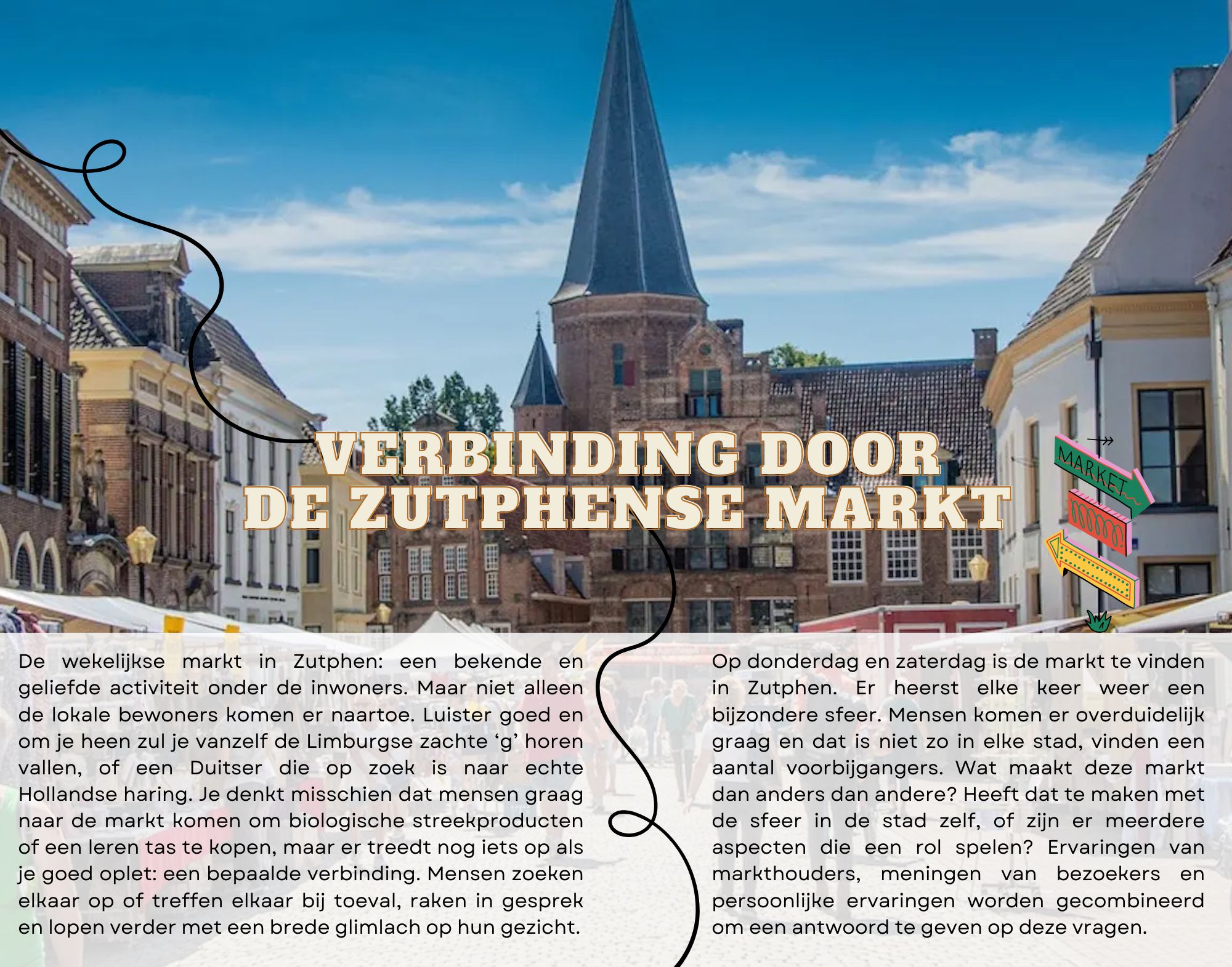 De wekelijkse markt in Zutphen is een plek waar veel inwoners naartoe gaan. Maar er zijn ook veel randstedelingen en toeristen te vinden. Niet alleen voor boodschappen: veel mensen komen juist naar het centrum om elkaar te ontmoeten en een praatje te maken. Hoe kan het dat deze markt zo’n grote invloed heeft op de sociale bindingen? In onderstaande posters wordt daar antwoord op gegeven.
